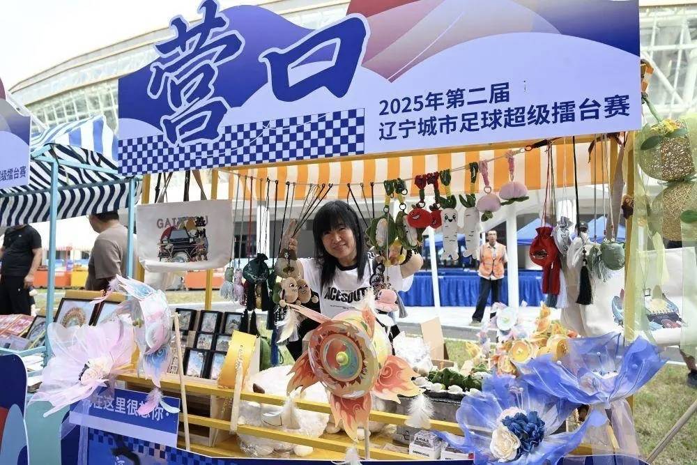 “辽超”场地旁,“辽超市集”营口摊位售卖文创等产品