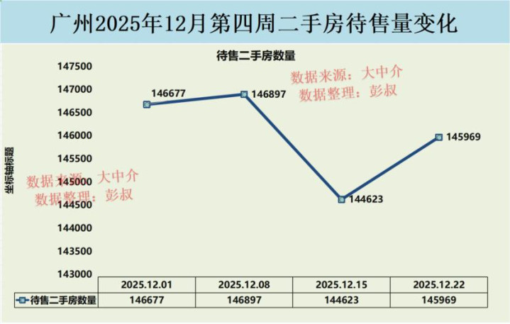 在进入到12月以后,从12月1日到12月22日,广州的待售二手房数量从146677套减少到了145969套,又少了一些。